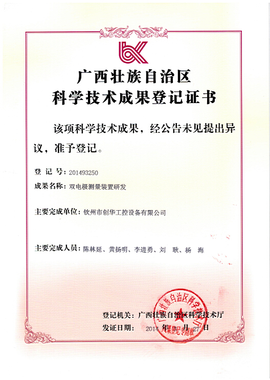 2014年1月20日,欽州市科學技術(shù)局組織有關(guān)專家對欽州市創(chuàng)華工控設備有限公司所承擔的“雙電極測量裝置研發(fā)”進行項目成果鑒定,鑒定委員會專家查閱了相關(guān)材料,聽取了承擔單位項目介紹,進行了質(zhì)疑答辯,經(jīng)過認真討論認為本項目利用高新技術(shù)改造傳統(tǒng)制糖產(chǎn)業(yè),有利于促進我國制糖行業(yè)的技術(shù)裝備水平的提升,研究成果達到了國內(nèi)領先水平。