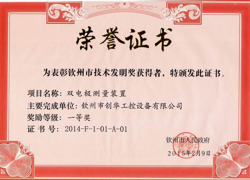 2015年12月30日下午3:00市委、市政府在市行政中心C座會議廳召開2015年欽州市科學技術獎勵大會暨促進科技成果轉化行動推進會,我公司產(chǎn)品《雙電極測量裝置》喜獲2014年度欽州市技術發(fā)明一等獎。